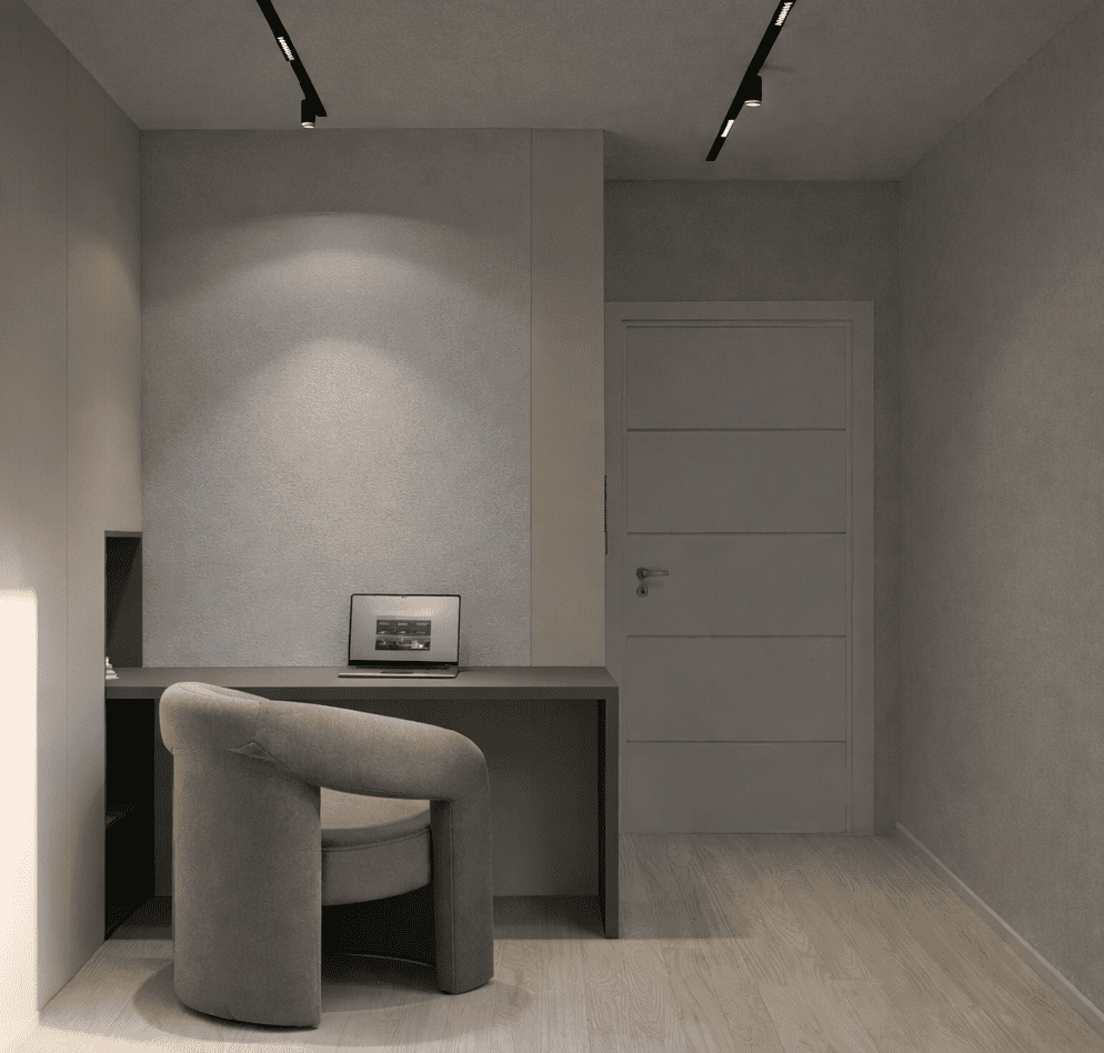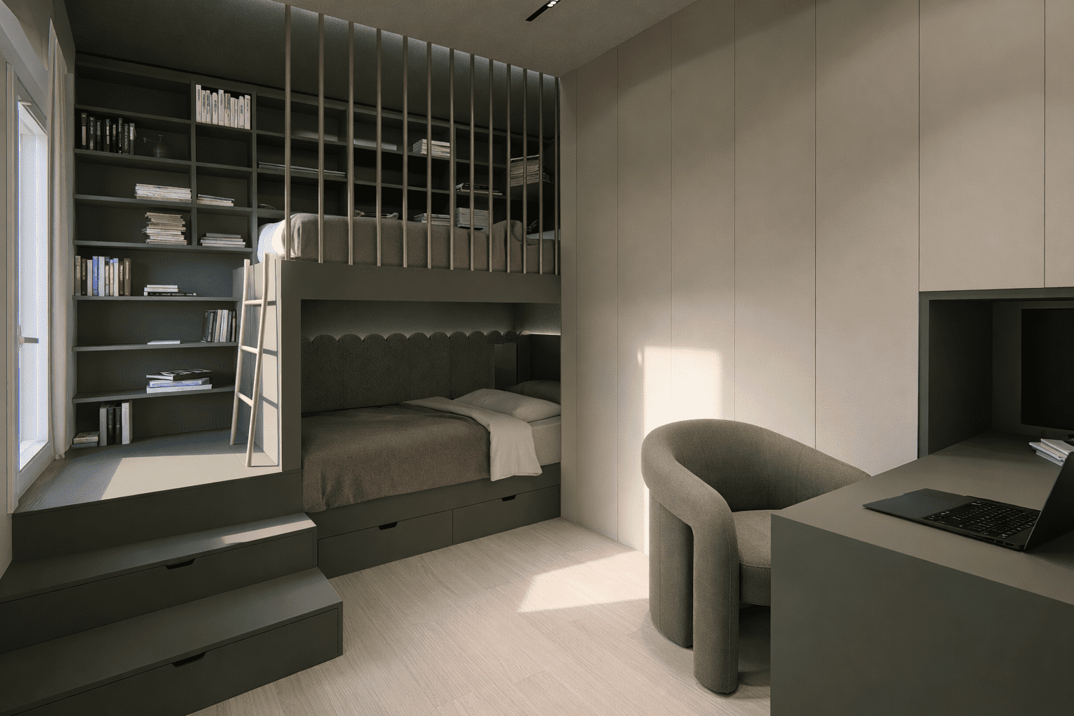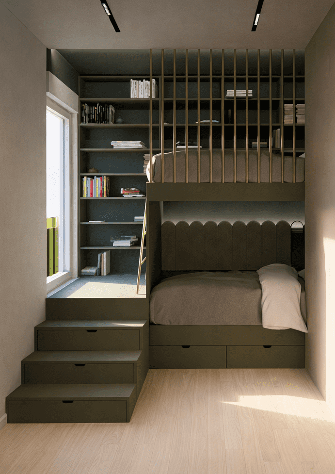 Funkcionalno osmišljeno rješenje interijera dječje sobe s integriranim elementima za spavanje, rad i pohranu, prilagođeno potrebama korisnika.