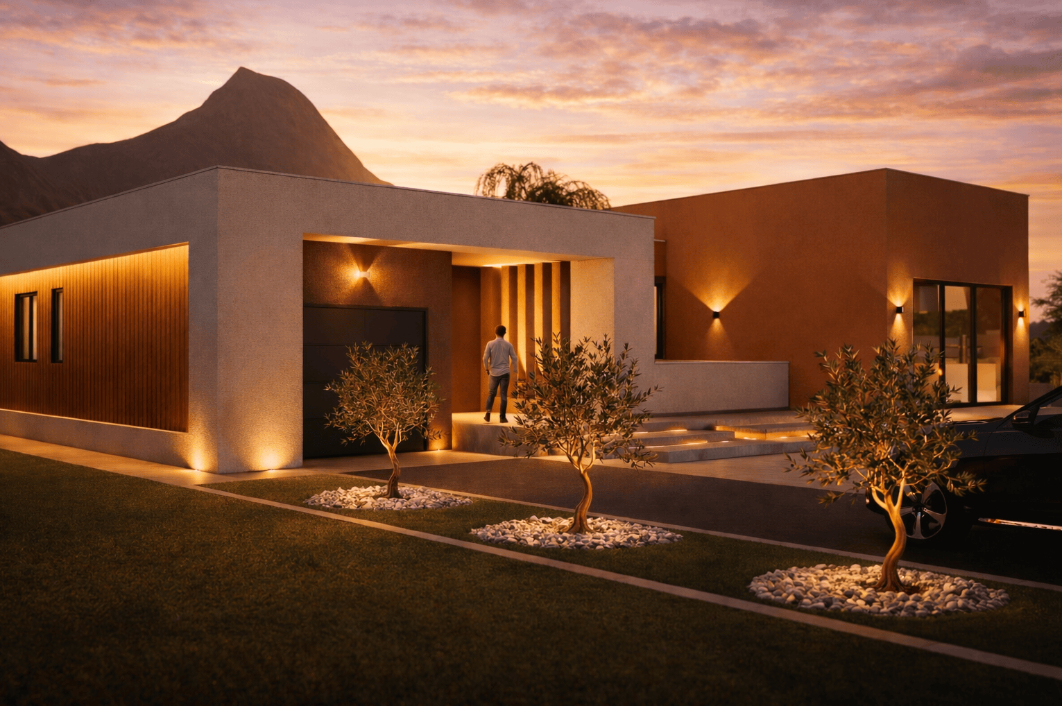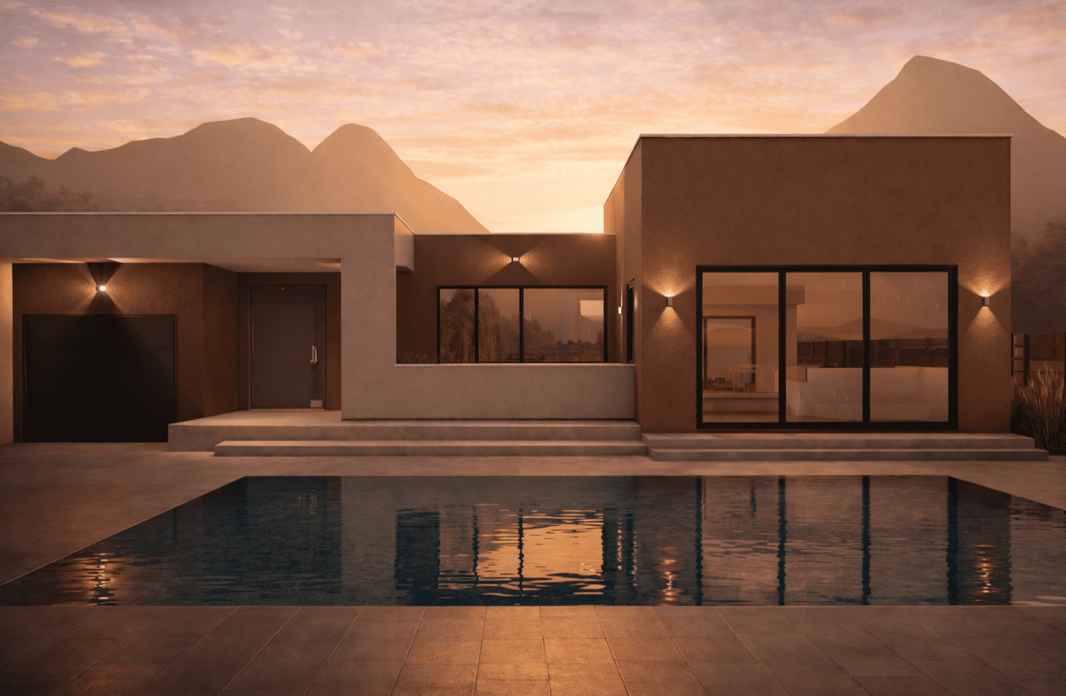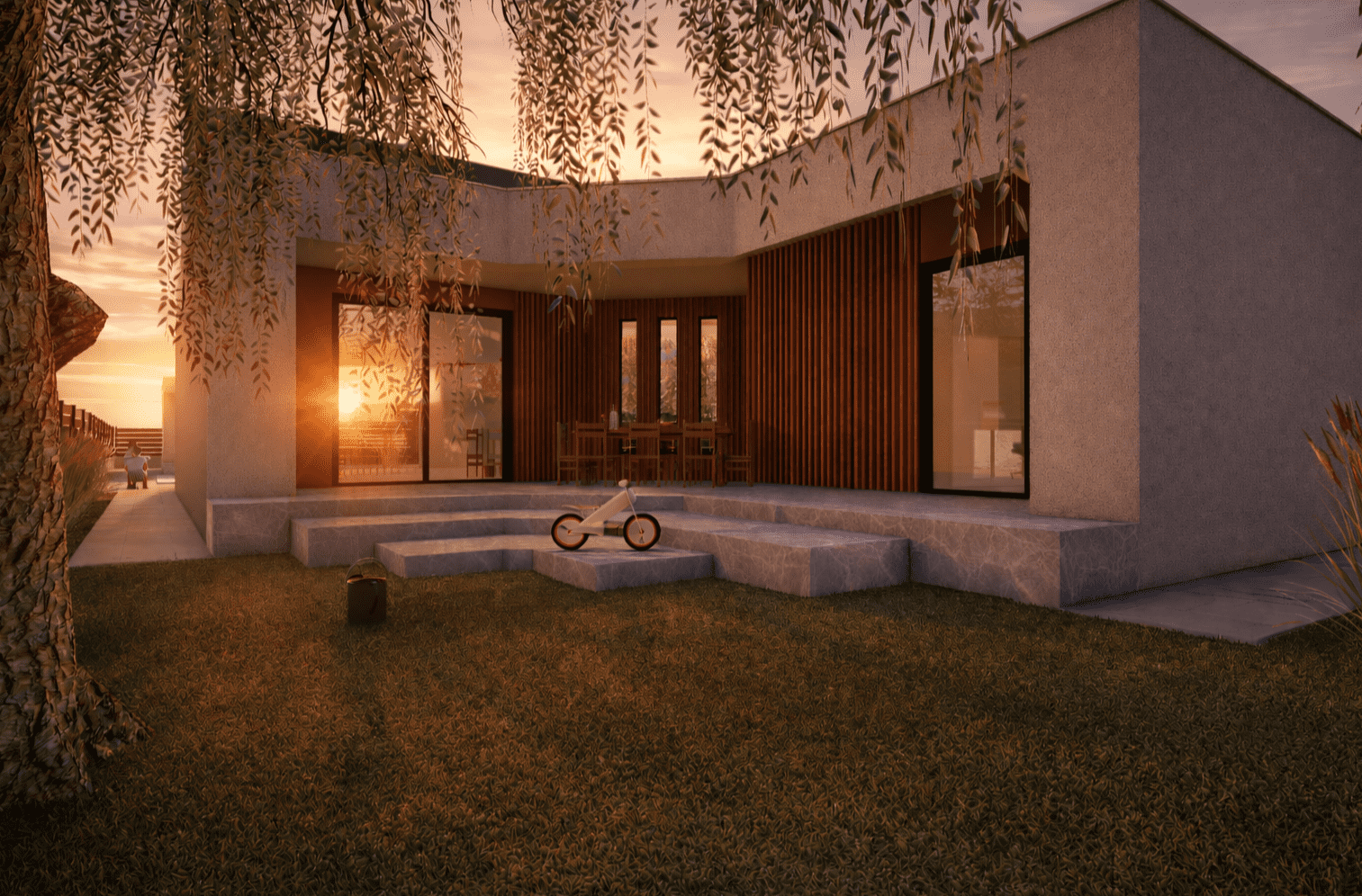 Arhitektonsko rješenje obiteljske kuće s jednostavnom volumetrijom i funkcionalnom organizacijom prostora, uz povezivanje unutarnjih prostora s vanjskim sadržajima i bazenom.